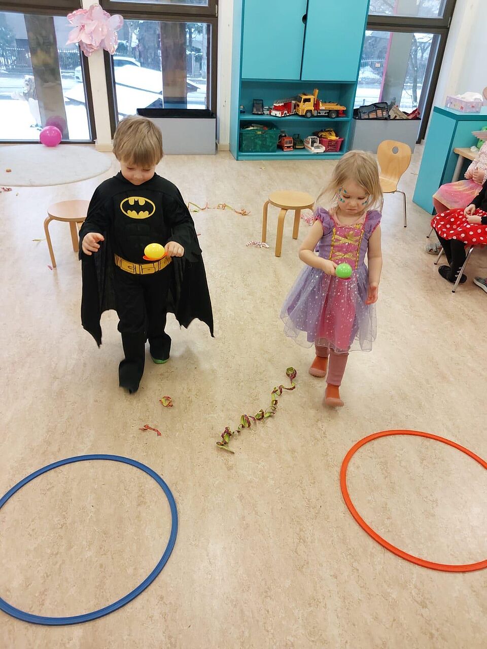 Im Foyer und im Turnraum wurde ausgelassen getanzt, denn dort wartete unsere Faschings-Disco auf die kleinen und großen Narren. Dazu gab es den ganzen Tag über lustige Spiele, Bewegung und jede Menge Lachen.