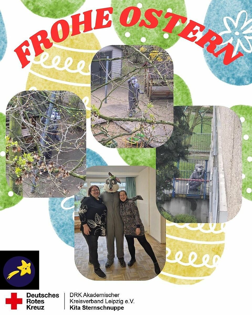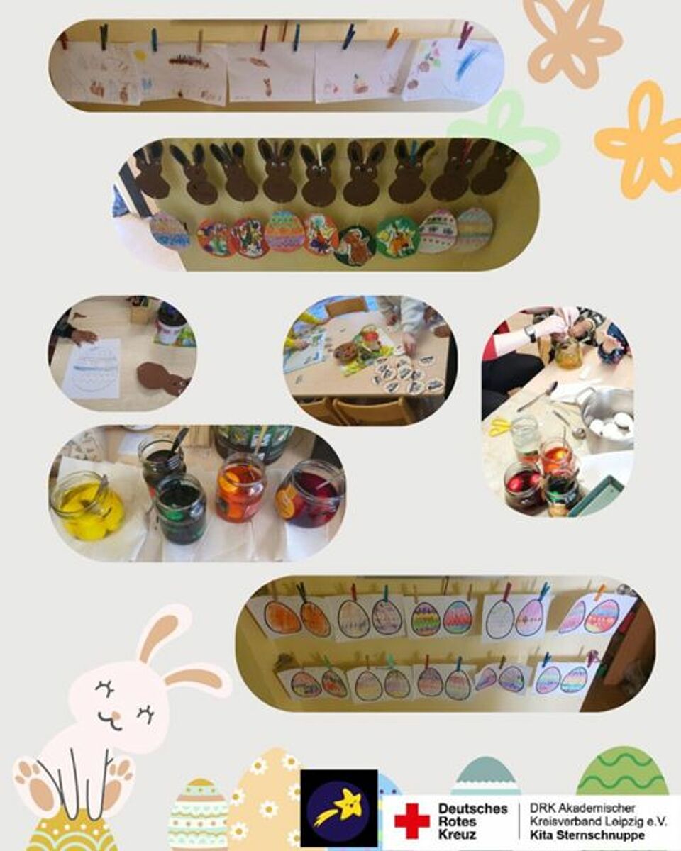 Auch in unserer KiFaz Kita “Sternschnuppe” in Leipzig-Grünau wurde ein ganz besonderer Gast empfangen. Er hatte sich durch den Garten in die Einrichtung geschlichen. Eine tolle Überraschung für Groß und Klein. Zudem wurde bereits im Vorfeld eine Menge vorbereitet. So hatte z.B. die Froschgruppe Eier und Hasen angemalt sowie ausgeschnitten. Ein tolles selbst gemaltes Osterbild durfte ebenfalls nicht fehlen. Außerdem wurden Frühlingslieder gesungen und Ostergeschichten vorgelesen. Als Höhepunkt färbte man zum Abschluss der Woche Ostereier.