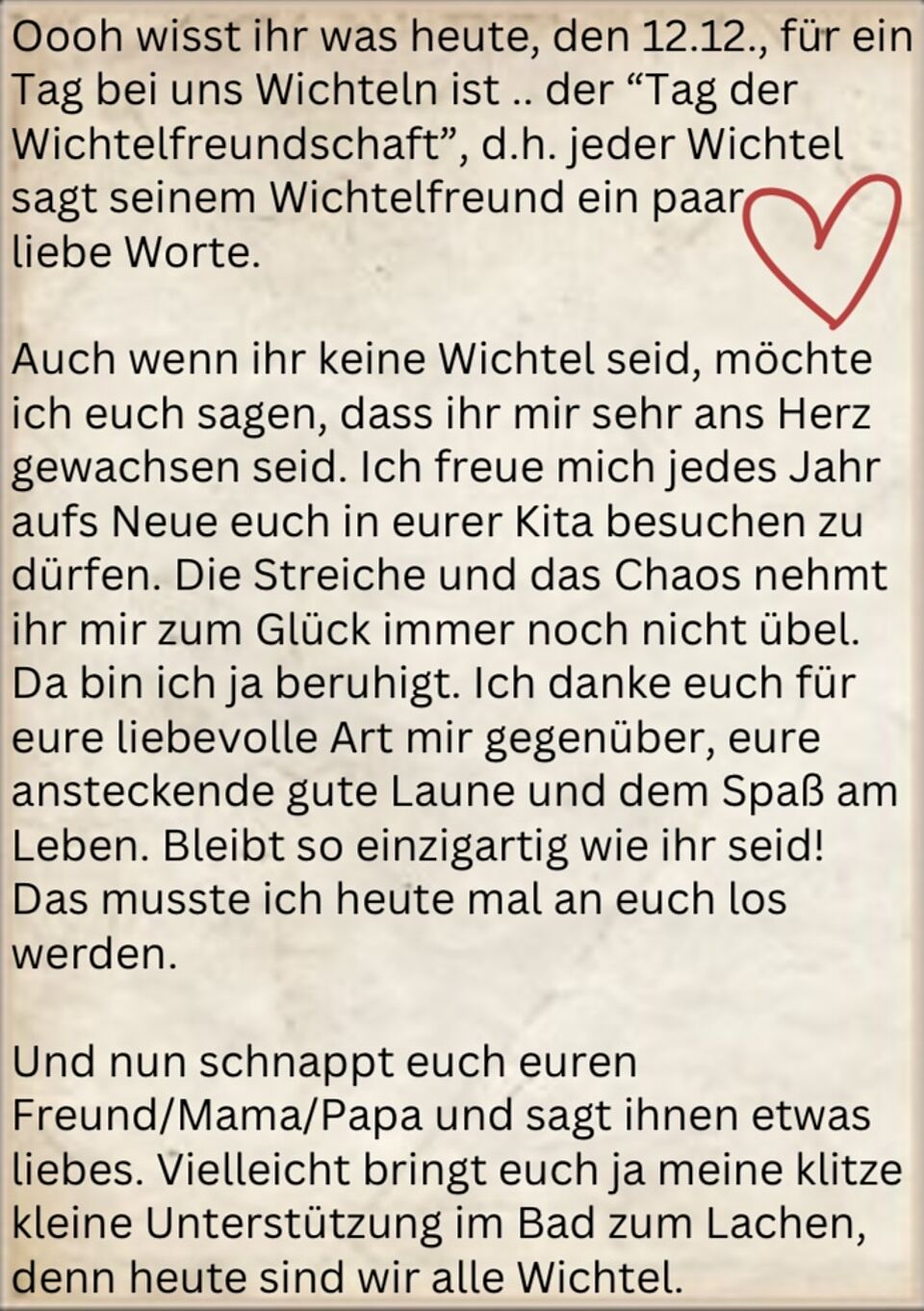 Im täglichen Wichtelfieber der Vorweihnachtszeit, werden die Kinder aufgefordert zu kleinen Mitmach- Aktionen. Letzte Woche konnten die Kinder sich ein wichteliges Lächeln ins Gesicht zaubern. Zudem besuchten die Wichtel Lumpi und Frido unsere Kita im Lichtenbergweg. Der Wichtelzauber wird wahr. Voller Eifer und Neugier begaben sich die Kinder auf die Suche nach den Wichteln .. und tatsächlich sind sie fündig geworden.