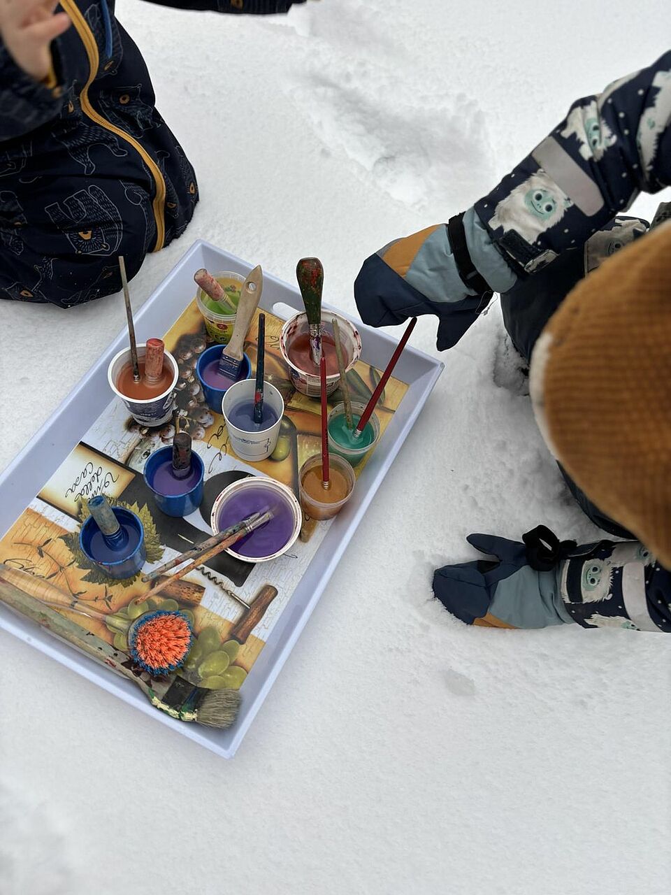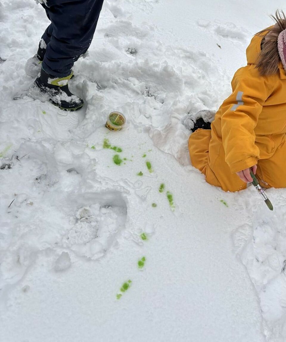 Wir nutzten das Winterwetter um gemeinsam mit den Kindern der Kita in der Jadassohnstraße im Schnee zu experimentieren. Die Kinder konnten auf spielerische Weise den Schnee mit Farben und Mustern gestalten. Dabei beobachteten sie aufmerksam, wie sich Farben ausbreiten , vermischen und sich verändern.
